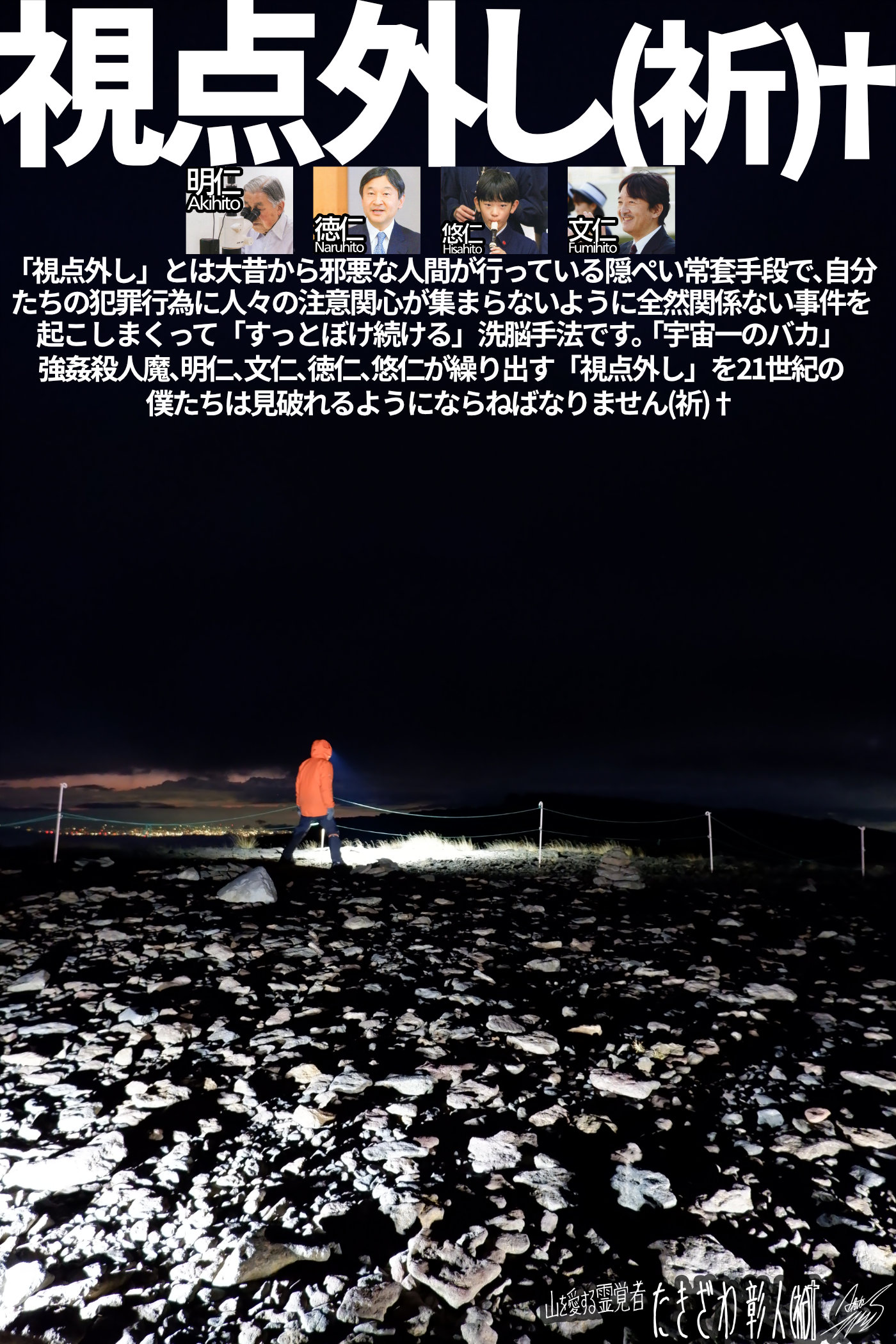 間もなく僕が公言している内容を一般の方々が恐怖に縮こまる事もなく暗殺の危機におびえる事もなく当たり前のように公言する時代がやってきます。なぜなら人々を永遠に脅迫で押さえつける事は絶対にできないからです。最終的には正義が必ず勝利を収めるようになっているのです。なぜなら僕たちの心には【神】がプレゼントして下さった「理性、良心」が具わっているからです。その理性、良心がイヤでも人々を正しい行動に駆り立て、遅かれ早かれ邪悪は滅ぼされるのです、単なる時間の問題です。ただ僕の希望としては「いつか皆さまも「宇宙一のバカ」大量強姦殺人魔、明仁、文仁、徳仁、悠仁の邪悪の正体を公言するようになる」のではなく、できれば今すぐに公言して頂きたい気持ちです。僕の使命遂行をご覧の方々の多くが「たきざわ彰人ガンバレ、強姦殺人魔をやっつけてくれ」と他力本願的に思っておられるかも知れませんが、イエイエ僕という人間には全く何のチカラもありません。社会は個人が集まってできています。ひとりひとりが行動を起こす事によって大きなムーブメントになっていきます…続きを読む→