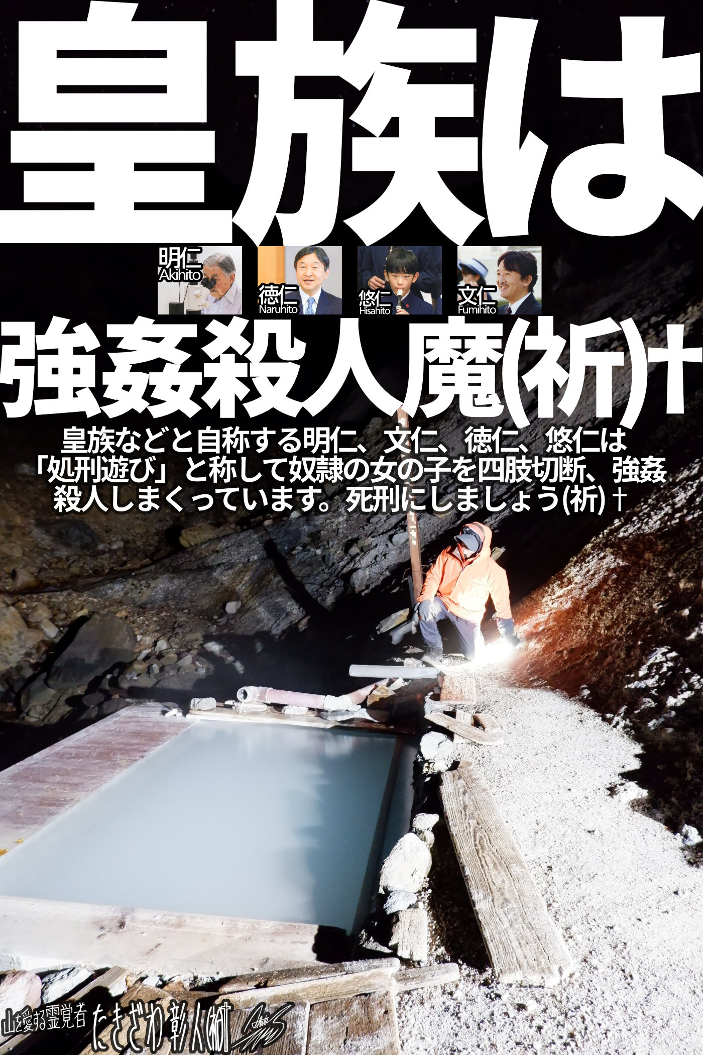 えー選挙の事は専門外で詳しく語れませんので使命遂行になぞらえてお話して終わりとさせて頂きます。もう聞き飽きた方もいらっしゃる事と思いますが「宇宙一のバカ」大量強姦殺人魔、明仁、文仁、徳仁、悠仁は、「処刑遊び」と称して幼い奴隷の女の子を日常的に四肢切断、強姦殺人して死肉を食べるという事を延々おこなっている、人類史上最悪の犯罪者であり殺人鬼です。