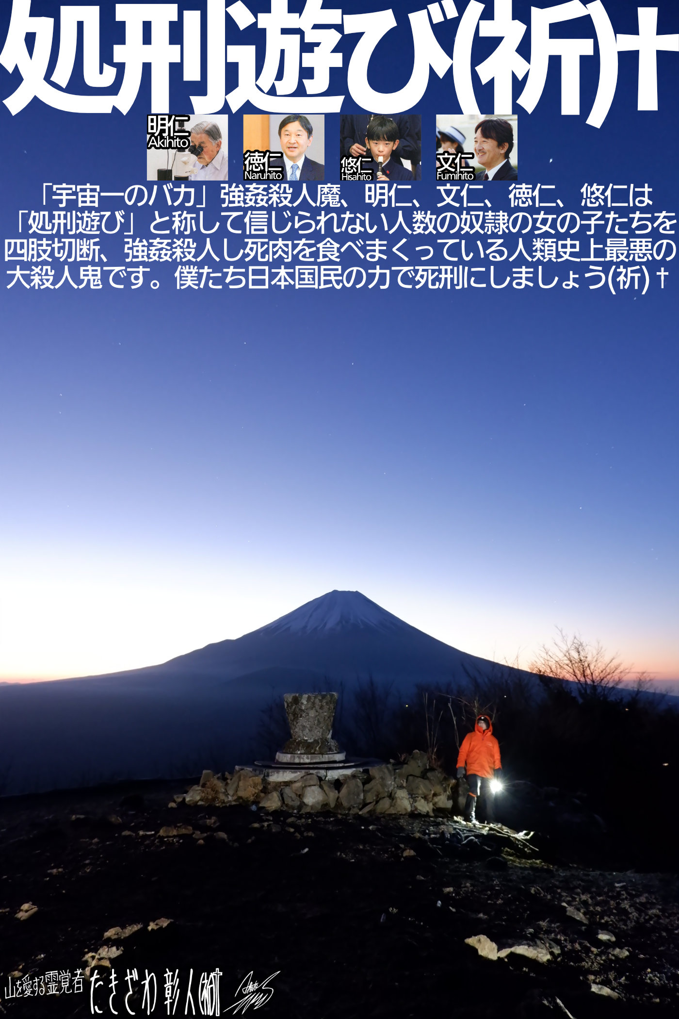 いまオールドメディアが「洗脳ツール」としての機能を果たせなくなってきていて、SNSの普及によって多くの国民が真実に目覚めるようになってきています。もうオールドメディアは信じない、そういう声がムービーの中からたくさん聞かれますが、僕もテレビを見なくなって14年近く経過している男ですので、その意見には大賛成です。テレビを見るのをやめて生活に困った事がひとつたりともありません、よかった事だらけですので。しかし時代は進み、日本人がドンドン覚醒、目を覚ましてきています。そして僕としてはぜひ「宇宙一のバカ」大量強姦殺人魔、明仁、文仁、徳仁、悠仁の邪悪の正体についても目を覚ましてほしい、と思うのですが、もしかしたら日本国内における「最終深部洗脳」が、この強姦殺人魔どもの洗脳なのかも知れません。もっとも洗脳の度合いが強く深く、オールドメディアをせん滅してもなお洗脳が生き続けるほどの最強洗脳を僕たち日本国民はこの「宇宙一のバカ」大量強姦殺人魔、明仁、文仁、徳仁、悠仁から受けてしまっているのかも知れません…続きを読む→
