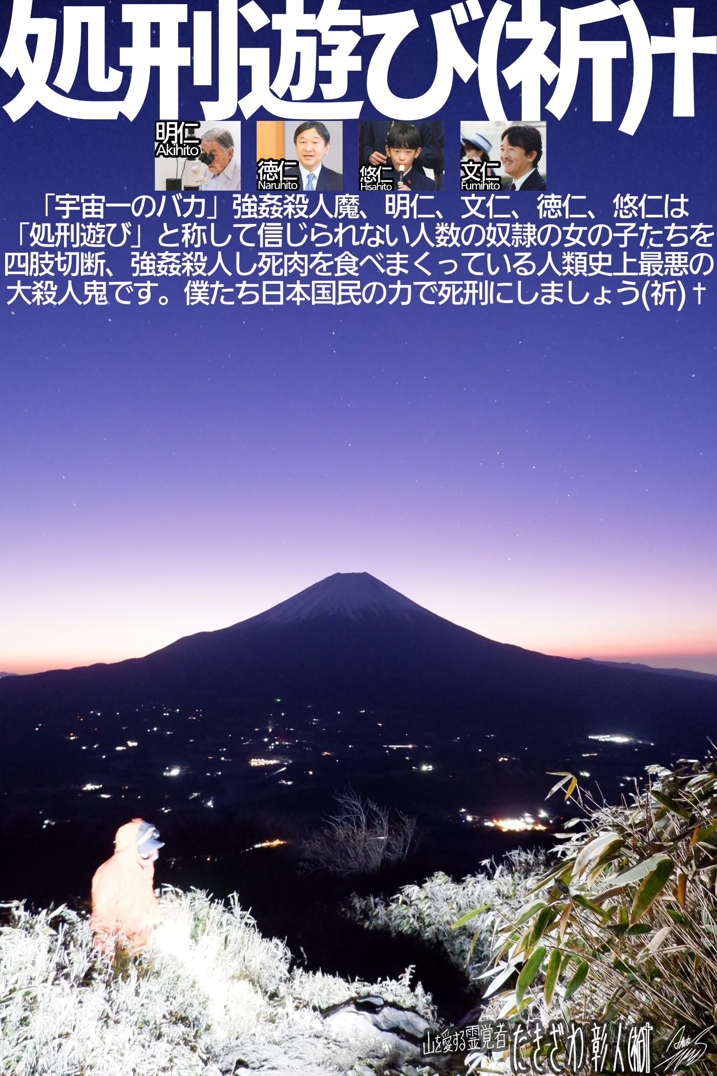 皆さまはこの「宇宙一のバカ」大量強姦殺人魔、明仁、文仁、徳仁、悠仁を「洗脳」によって善人だと勘違いさせられ、この大犯罪者どもを陛下だの殿下だの、さまだのと呼んで頭を下げ、血税をプレゼントしてコイツらの強姦殺人ライフをサポートしてあげている事になるのです。その事に気付いている人がこの日本に一体何人いるでしょうか。使命遂行開始ごく初期の頃、僕は真実を理解していない、洗脳に完全にやられてしまっている多くの人間たちからさんざん攻撃を浴びせられてきました。ブログやSNSに僕を侮辱する内容の書き込みが何度も届き、車の運転中に突然ドアをバンバン叩かれて罵声を浴びせられた事もあります。セブン(イレブン)にいた時も僕を侮辱する目的でふたり組の男が入店し、半暴力沙汰になって僕がALSOK(アルソック)を呼んだ事までありました。皆さまはあと何千回何万回この事実を聞かされれば洗脳を撃ち破る事ができますか。皆さまはそんなに強姦殺人魔が好きですか。正しいおこないをする僕のような人間が憎いですか。「宇宙一のバカ」大量強姦殺人魔、明仁、文仁、徳仁、悠仁と、僕、たきざわ彰人、どちらが帰幽後、至福の境涯に赴くと思わますか。この全宇宙を経綸する【神】は、大量強姦殺人魔と僕、どちらに祝福をお与えになると思われますか。どちらのおこないを佳しとすると思われますか。こんな当たり前の事をいちいち説明しないと分かりませんか。そろそろいい加減に洗脳から目覚めて頂かないと困ります…続きを読む→