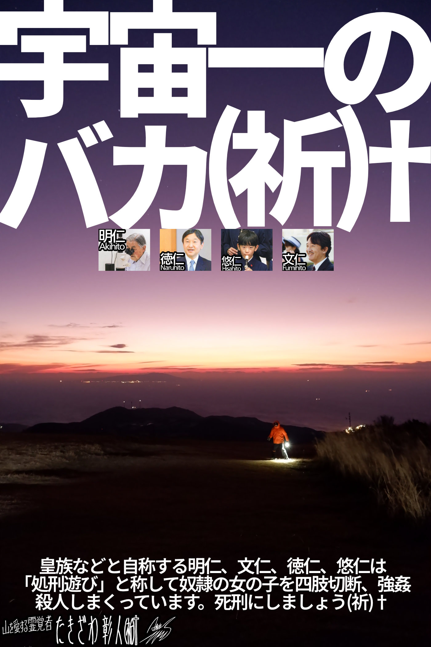 聖書には真実でない事がたくさん書かれています。人類史上最大の汚辱と言っても過言ではない「ニケーア会議」の時に様々なウソが聖書に書き加えられ、そのウソが世界中に広まっていき、イエス様の2000年の苦悩へとつながっていったのです。キリスト者はイエス様の御名を悪用して私腹を肥やす事を2000年にわたって続けてきました。特に中世ヨーロッパの暗黒時代が最悪で、キリスト教の要職についていた人間たちは、自分たちの地位、生活を守るために真実を公言する人間を徹底的に処刑してきました。キリスト教の人間が「主よ、主よ」とイエス様の御名を連呼する時、それはイエス様に対する最大級の侮辱であり、イエス様の悲しみをさらに増幅させ、積年の誤謬(ごびゅう)を払拭するどころかさらに加速させ続ける、イエス様をさらに十字架にかけ続ける許されざる呪いの行為となります。僕、たきざわ彰人からお願いしたい事としましては、間違いだらけの聖書を読むのはやめましょう。「シルバーバーチの霊訓」を筆頭とした正真正銘の霊関連書籍に目を通すようにしましょう。そして教会に足を運ぶのもやめた方がイイでしょう…続きを読む→