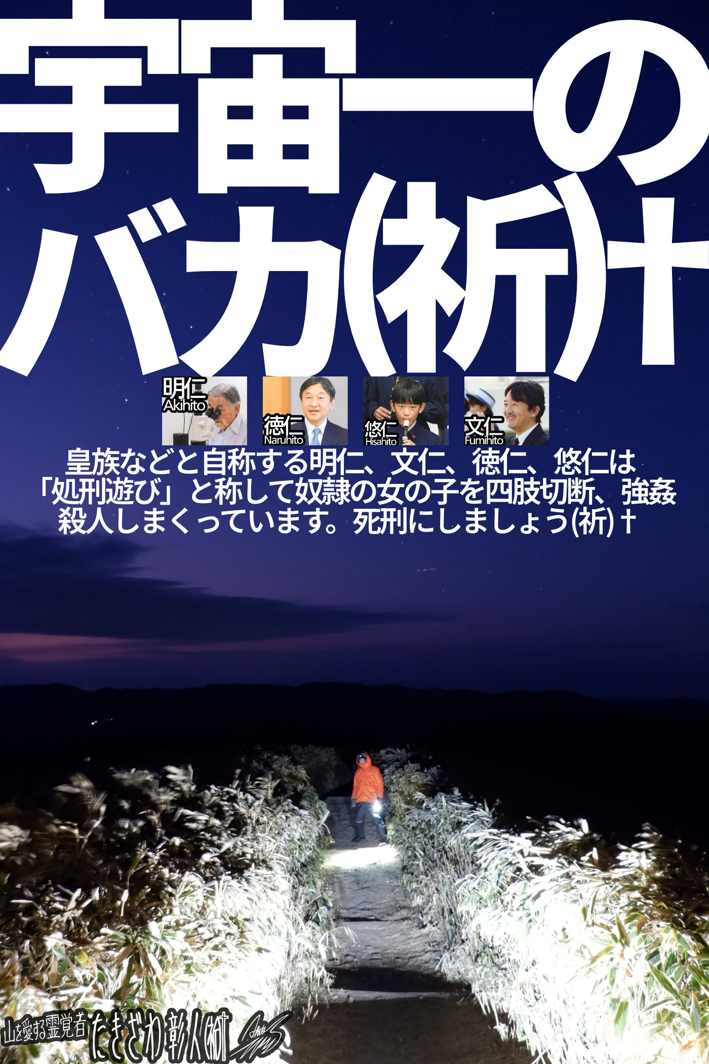 いまオールドメディアが「洗脳ツール」としての機能を果たせなくなってきていて、SNSの普及によって多くの国民が真実に目覚めるようになってきています。もうオールドメディアは信じない、そういう声がムービーの中からたくさん聞かれますが、僕もテレビを見なくなって14年近く経過している男ですので、その意見には大賛成です。テレビを見るのをやめて生活に困った事がひとつたりともありません、よかった事だらけですので。しかし時代は進み、日本人がドンドン覚醒、目を覚ましてきています。そして僕としてはぜひ「宇宙一のバカ」大量強姦殺人魔、明仁、文仁、徳仁、悠仁の邪悪の正体についても目を覚ましてほしい、と思うのですが、もしかしたら日本国内における「最終深部洗脳」が、この強姦殺人魔どもの洗脳なのかも知れません。もっとも洗脳の度合いが強く深く、オールドメディアをせん滅してもなお洗脳が生き続けるほどの最強洗脳を僕たち日本国民はこの「宇宙一のバカ」大量強姦殺人魔、明仁、文仁、徳仁、悠仁から受けてしまっているのかも知れません…続きを読む→