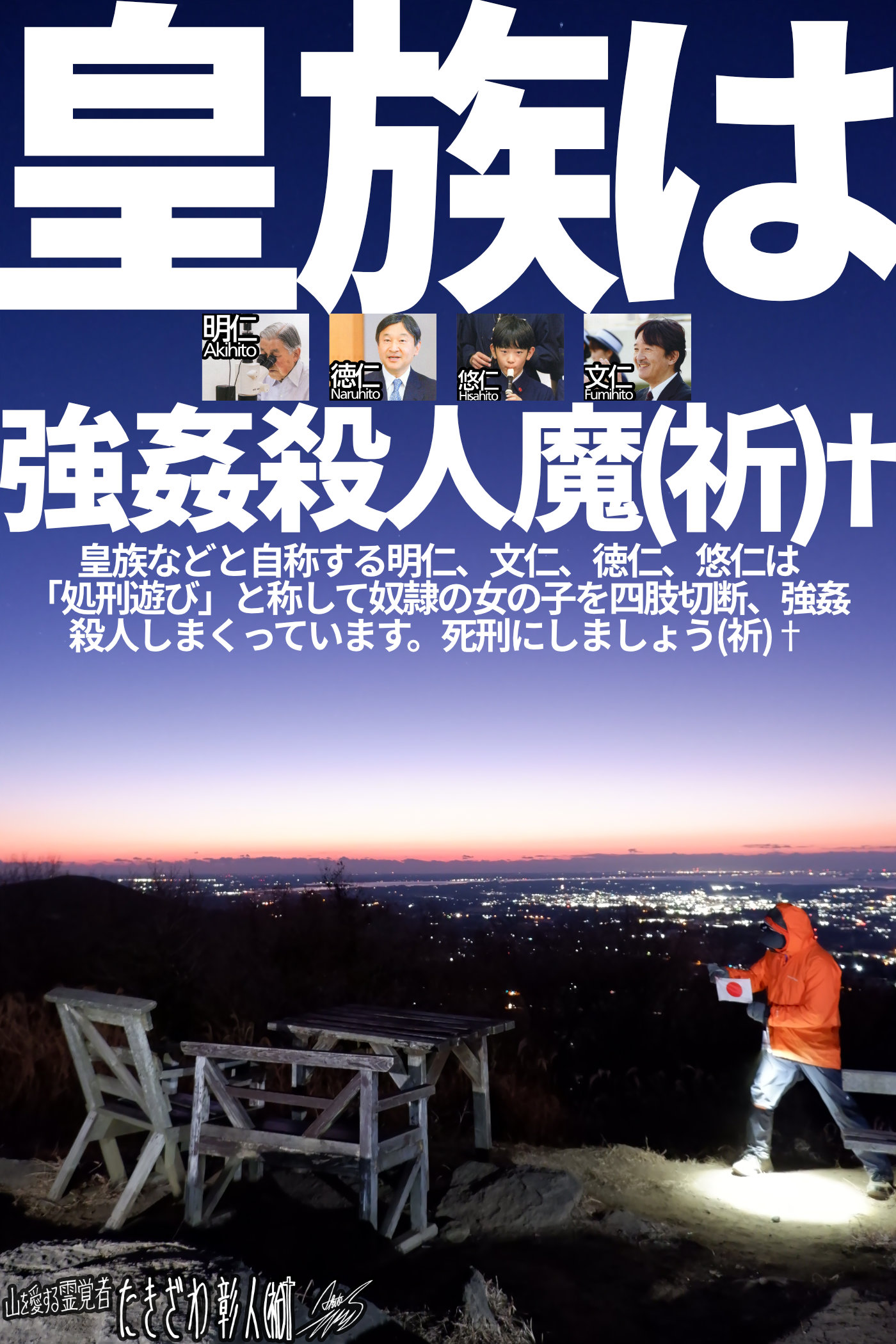 つまり反逆前の、あの謙虚だった霊性発現初期の頃のアキトくんに帰れと霊団が言ってきているのです。僕はこの言葉をそのまま霊団に返そうと思います。「宇宙一のバカ」大量強姦殺人魔、明仁、文仁、徳仁、悠仁の邪悪の正体を僕にガンガン降らせていた時の、奴隷の女の子たちの悲劇の惨状を僕に怒涛に教えていた時の霊団に帰れ、と。
