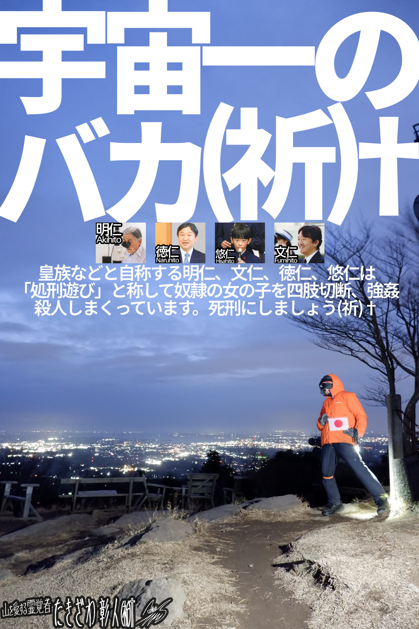 皆さまはこの「宇宙一のバカ」大量強姦殺人魔、明仁、文仁、徳仁、悠仁を「洗脳」によって善人だと勘違いさせられ、この大犯罪者どもを陛下だの殿下だの、さまだのと呼んで頭を下げ、血税をプレゼントしてコイツらの強姦殺人ライフをサポートしてあげている事になるのです。その事に気付いている人がこの日本に一体何人いるでしょうか。使命遂行開始ごく初期の頃、僕は真実を理解していない、洗脳に完全にやられてしまっている多くの人間たちからさんざん攻撃を浴びせられてきました。ブログやSNSに僕を侮辱する内容の書き込みが何度も届き、車の運転中に突然ドアをバンバン叩かれて罵声を浴びせられた事もあります。セブン(イレブン)にいた時も僕を侮辱する目的でふたり組の男が入店し、半暴力沙汰になって僕がALSOK(アルソック)を呼んだ事までありました。皆さまはあと何千回何万回この事実を聞かされれば洗脳を撃ち破る事ができますか。皆さまはそんなに強姦殺人魔が好きですか。正しいおこないをする僕のような人間が憎いですか。「宇宙一のバカ」大量強姦殺人魔、明仁、文仁、徳仁、悠仁と、僕、たきざわ彰人、どちらが帰幽後、至福の境涯に赴くと思わますか。この全宇宙を経綸する【神】は、大量強姦殺人魔と僕、どちらに祝福をお与えになると思われますか。どちらのおこないを佳しとすると思われますか。こんな当たり前の事をいちいち説明しないと分かりませんか。そろそろいい加減に洗脳から目覚めて頂かないと困ります…続きを読む→