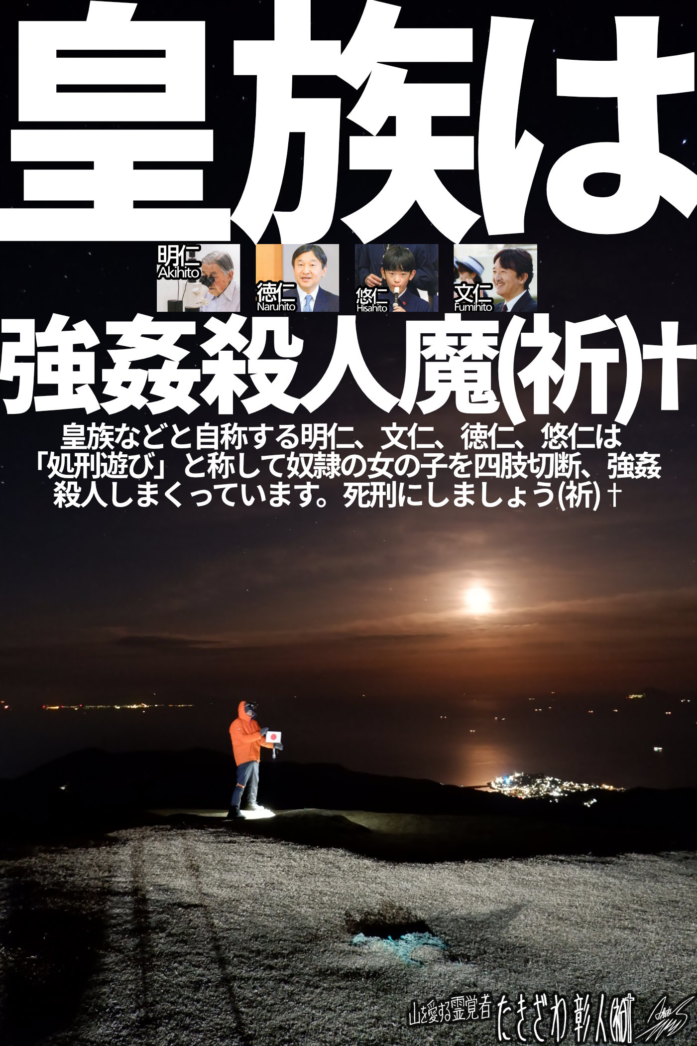 ハイ、何ひとつ確かな情報がない中で霊団の言ってくる内容のみを頼りにブログを書くと、このように宙ぶらりんなテキストになってしまうのです。霊団はもう「宇宙一のバカ」大量強姦殺人魔、明仁、文仁、徳仁、悠仁の邪悪の正体および奴隷の女の子の悲劇の惨状については何の興味も示しません。